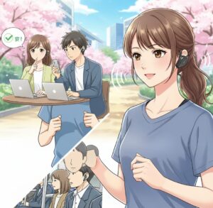 通勤電車内では車内アナウンスを聞き逃さず、在宅ワークでは呼び鈴にも即反応。耳を塞がない設計はながら聴きニーズに最適です。