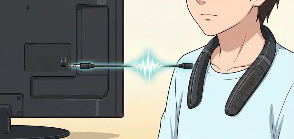 テレビの音をネックスピーカーで聴きたい場合、テレビ側の「イヤホンジャック」をどう活用するかがポイントになります。