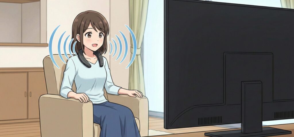 ネックスピーカーをテレビで使用したい人が最も気にすべき点は**「映像と音のズレ(遅延)」**です。