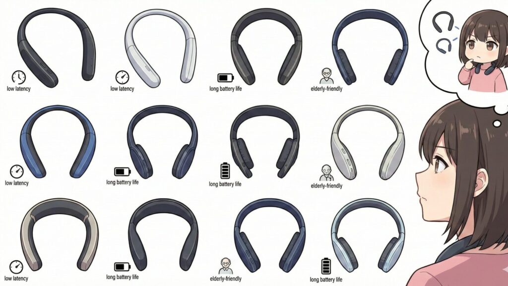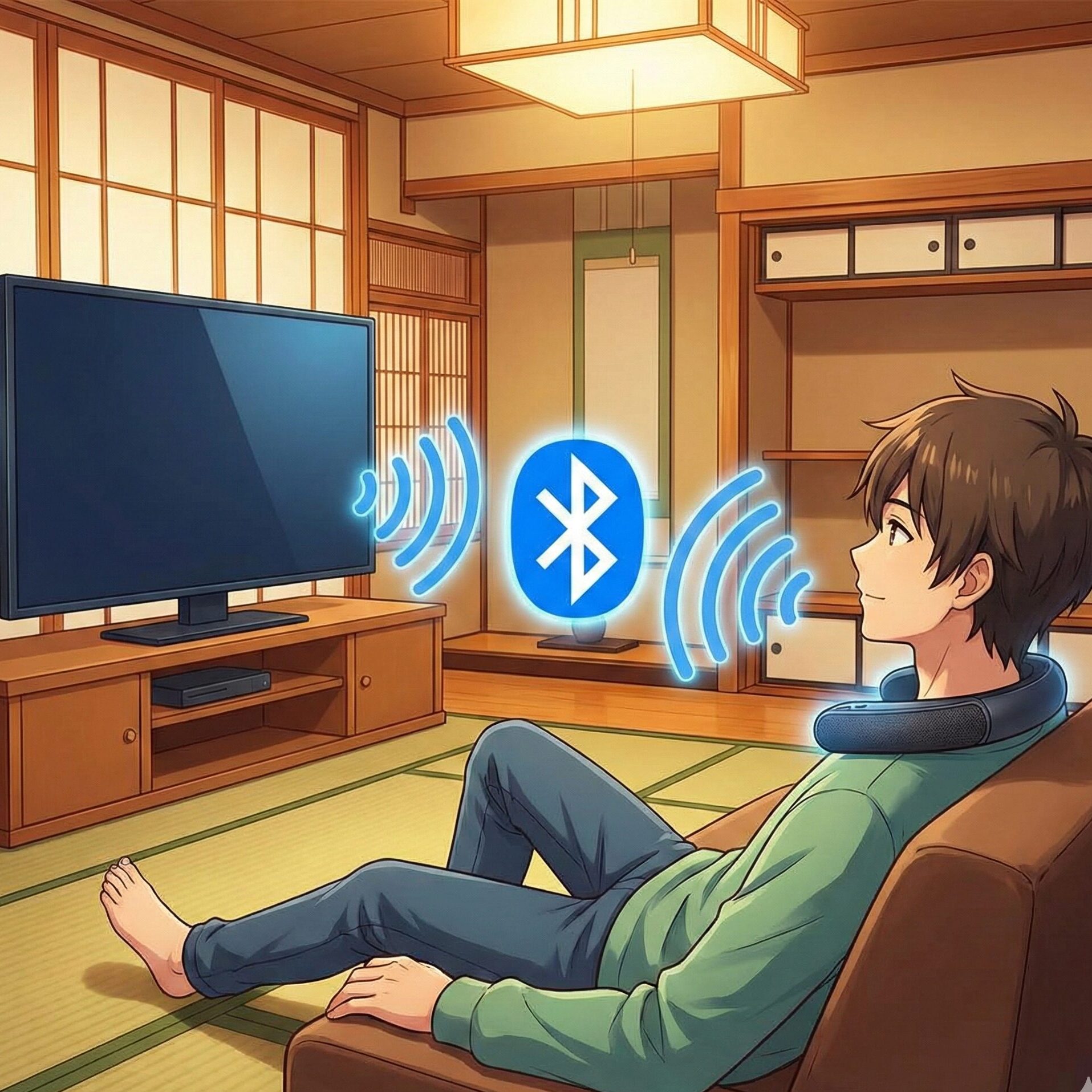テレビ用途でネックスピーカーを選ぶ際、音楽鑑賞用とは全く異なる「重要な基準」があります。それは**「映像と音のズレ(遅延)」と「人の声の聞き取りやすさ」**です。ここを間違えると、「口パクと声が合わなくて気持ち悪い」という失敗に繋がります。