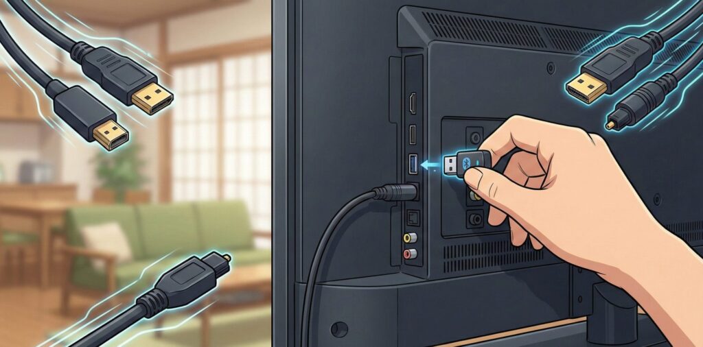 テレビにBluetooth機能がない場合、**「Bluetooth送信機(トランスミッター)」**という周辺機器が必要になります。