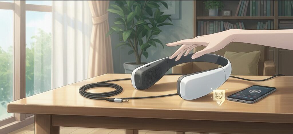 一方で、2の両対応タイプは、普段はスマホとBluetoothで繋ぎ、ゲームをする時だけ付属のオーディオケーブルで有線接続するという使い分けが可能です。3,000円〜5,000円前後の「格安ネックスピーカー」の多くは、実はこの「両対応(AUX入力付き)」であることが多いです。