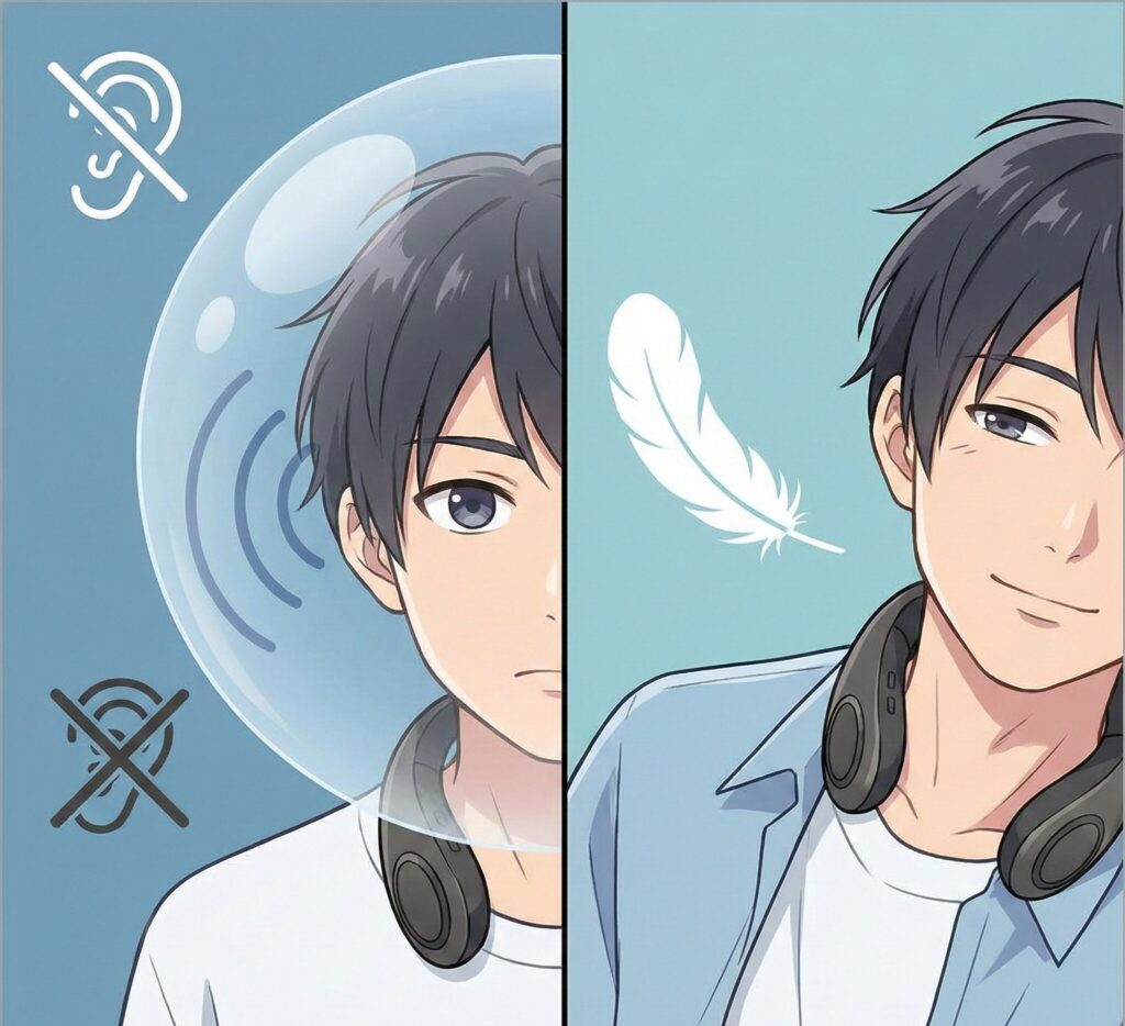 • リビングでの共存:家族がテレビを見ている横で、自分がネックスピーカーで別の動画を見る、といった使い方は「音量次第」です。小音量なら気になりませんが、迫力を求めて音量を上げると干渉します。