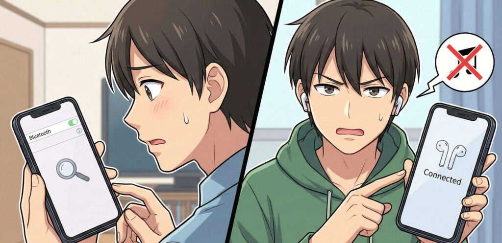 通勤電車の中や、大事なWeb会議の直前にワイヤレスイヤホンがBluetoothに繋がらないトラブルに見舞われると、非常に焦りますよね。スマホを再起動しても直らないと、「もしかして故障?」と不安になるかもしれません。