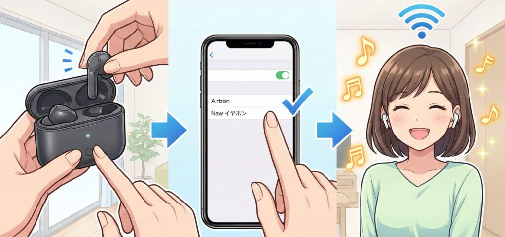 ワイヤレスイヤホン ペア リング 方法(Bluetoothイヤホン ペア リング 方法)の基本フローをおさらいしましょう。
